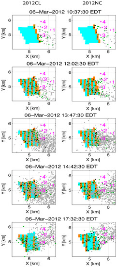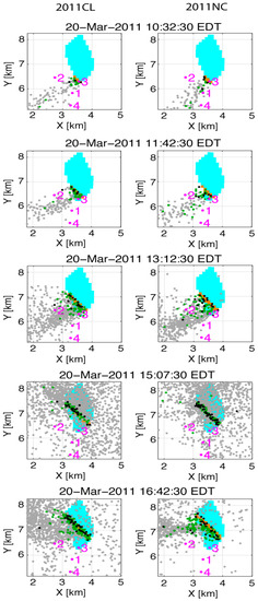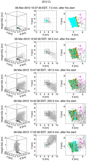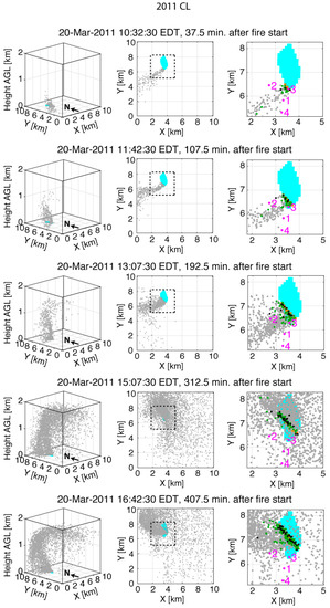 AC/F simulated smoke plumes in the 2011 and 2012 control simulations (2011CL and 2012CL) are shown in Figure 2; Figure 3, respectively. The full-domain three-dimensional particle plots in the 2011 case (Figure 2, left panels) indicate an initially shallow plume at 10:32:30 EDT that develops into a plume with a depth of 1–2 km by 15:07:30 EDT. The 2011CL plume is tilted from vertical due to the mean flow, but it is more upright than the plume in the 2012CL simulation (cf. Figure 2 and Figure 3).