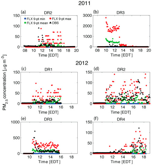 Comparisons between the time series in Figure 4a,b and the top-down particle plots in Figure 2 (right panels) help explain the differences in timing at DR3. The timing differences between the AC/F simulation and the observations are attributed to uncertainties in the representation of the burn unit in AC/F. DR3 was in reality located at the southern tip of the burn unit [21], immediately east of the initial ignition line (ignition: 09:55 EDT), but due to the somewhat coarse representation of the burn unit in AC/F, the closest grid point to the instrument coordinates is located inside the simulated burn unit (Figure 2). Thus, while it took until 10:44 EDT for PM2.5 concentrations at DR3 to exceed ambient values, simulated PM2.5 concentrations in the 9-point zone exceed ambient by 09:57 EDT, only two minutes after ignition. The comparison between the AC/F and Dataram concentration time series during the 2011 case illustrates the difficulty inherent in making smoke predictions at such fine spatial and temporal scales: small-scale details of the fire, fuels, and meteorological conditions become critically important for accurate smoke simulations, but are not straightforward to represent with fidelity in the model.