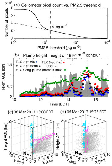 (a) Ceilometer pixel count as a function of PM2.5 threshold used to mask background (i.e., ambient) PM2.5 concentration (solid line), with 15 µg m−3 threshold (long dash line) and linear extrapolation below 15 µg m−3 (short dash line) indicated. (b) Time-height cross-sections of PM2.5 concentration during the 2012 case (2012CL). Ceilometer observed PM2.5 concentrations greater than or equal to 15 µg m−3 are shaded, and time series of the minimum, mean, and maximum height of the 15 µg m−3 value in the AC/F simulations for a nine-grid-point box centered on the ceilometer location, as well as the domain-maximum value, are indicated with filled markers (see legend). (c,d) Visualization of plumes at (c) 13:00 EDT and (d) 15:25 EDT, with the ceilometer profile and plume centerline indicated with teal and magenta lines, respectively.
