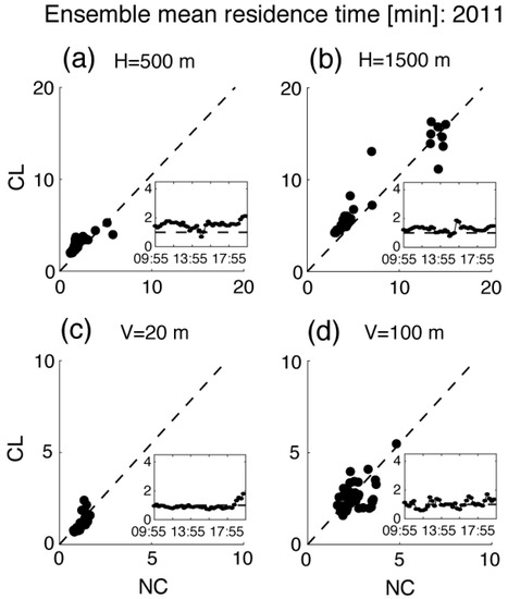 Scatter plots of ensemble mean residence time within horizontal radii of (a) 500 m and (b) 1500 m from each particles release point and vertical depths of (c) 20 m and (d) 100 m above each particles’ release level. The no-canopy simulation (2011NC) is plotted on the x-axis and the control simulation (2011CL) is plotted on the y-axis. Time series of the ratio of mean residence times are included in inset panels (x-axis: time [EDT]; y-axis: 2011CL mean residence time divided by 2011NC mean residence time). The dashed line (at y = 1) shows where the 2011CL value equals the 2011NC value.