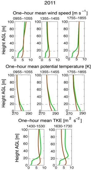 The influence of the forest canopy is evident in the reduction of near-surface mean wind speed (Figure 8, top row), where wind speeds in the lowest 18 m (mean canopy height) are about 5–6 m s−1 in 2011NC, but only 1–2 m s−1 in 2011CL. Weaker winds in the near-surface layer are consistent with the longer horizontal residence times noted for 2011CL in Figure 7. Recall from the average plant area density profile in Figure 1c that the densest vegetation in the 2011 burn unit was located in the understory, coincident with the fire, with a secondary maximum in vegetation density located at about 2/3 canopy height. Near-surface values of mean potential temperature are 6–7 K higher in 2011CL than in 2011NC. This result is consistent with the findings of Kiefer et al. [12], wherein reduced mixing due to canopy drag was shown to result in higher air temperatures inside the canopy. However, the colocation of the heat source and densest vegetation in the 2011 case (Figure 1c) suggests that the effect of vegetation on potential temperature may be greater here than in simulations presented in Kiefer et al. [12], wherein the densest vegetation was displaced about 12 m above the heat source (see their Figure 1). The resulting potential temperature profile yields greater surface buoyancy in 2011CL, consistent with the more upright smoke plume compared to 2011NC (not shown).