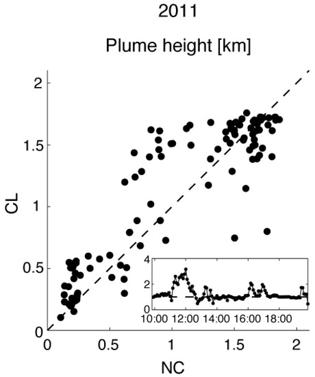 Finally, Figure 9 presents the impact of the forest canopy on plume height, diagnosed from the height of the 15 µg m−3 domain-maximum five-minute mean concentration contour in the AC/F simulations (as in Section 3.1). The complex pattern of points in the scatter plot makes an assessment of the impact of the forest canopy on plume height challenging. The time series of the ratio of plume heights in the two simulations (Figure 9, inset panel) shows that the plume height ratio is more variable during the first half of the simulation (09:55–14:55 EDT) than during the second half (14:55–19:55 EDT). The mean difference between the 2011CL and 2011NC plume heights during the first half of the simulation is 60 m (~9% of the mean). A deeper plume in 2011CL is consistent with greater buoyancy resulting from higher surface potential temperatures (Figure 8), and longer mean residence times in the vicinity of the fire (Figure 7). The scatter plot shows that plume heights of about 1.6 km occur frequently in 2011CL (between 14:55 and 19:55 EDT, when mixing heights near the fire vary between about 1.5 and 2 km; not shown), whereas during the same time period, plume heights in 2011NC vary between about 0.8 and 1.8 km. Despite this variability, the plume height ratio is smaller during the second half of the simulation because the overall plume heights are greater. The mean difference between the 2011CL and 2011NC plume heights during the second half of the simulation is 101 m (~7% of the mean), again indicating a deeper plume with the forest canopy present.