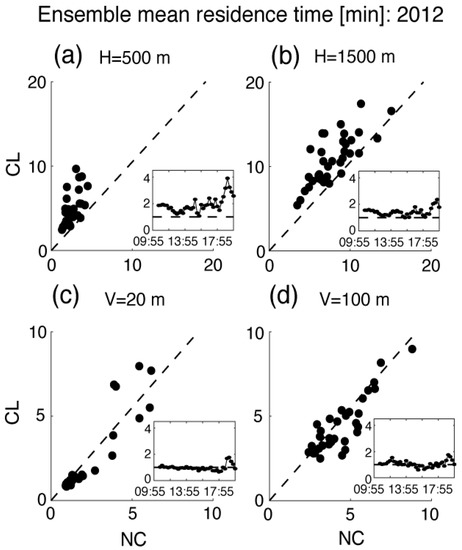 Scatter plots of mean residence times for the 2012 case (Figure 11) reveal differences between the 2012CL and 2012NC simulations in the horizontal (Figure 11a,b) and vertical (Figure 11c,d) directions. For horizontal radii of 500 m and 1500 m, mean residence times are on average 93% and 44% longer, respectively, for 2012CL; the differences are larger than, but of a similar magnitude to, what was found in the 2011 case. Larger differences in the 2012 case may be related to the weaker fire heat source, which allows the influence of the canopy on horizontal dispersion to be more pronounced. Vertical mean residence times for 20 m and 100 m depths are on average 1% shorter and 7% longer, respectively, in the 2012CL case. Similar to the 2011 case, the finding of shorter mean residence time in 2012CL only applies to the 20 m depth; for depths of 40 m or greater, mean residence time is longer in 2012CL than 2012NC. Also similar to the 2011 case, the impact of the forest canopy on horizontal dispersion is greater than for vertical dispersion.