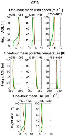 Time- and space-averaged mean wind speed, potential temperature, and TKE in 2012CL and 2012NC (Figure 12) reveal that although the impact of the canopy on mean wind speed is comparable for the 2011 and 2012 cases, the impact on mean potential temperature and mean TKE is smaller in 2012 (compare green and brown lines in Figure 8; Figure 12). Specifically, the reduction in mean wind speed due to the canopy is about 2–4 m s−1 in the 2011 and 2012 cases, while the reduction in mean TKE due to the canopy is smaller in 2012 (0.5–2 m2 s2 reduction compared to a 3.5–5 m2 s2 reduction in 2011), and the increase in mean potential temperature due to the canopy is smaller in 2012 (1–1.5 K increase compared to a 2.5–4 K difference in 2011). Despite the differences in plant area density profiles in the two cases (Figure 1c,d), the impact of canopy drag on mean wind speed is comparable. However, the impact of the canopy on potential temperature, and consequently buoyancy, is weaker in the 2012 case than the 2011 case. This is partly the result of the weaker fire heat source in 2012, and partly due to the relative absence of vegetation near the ground where the fire heat source is strongest. The mitigating effect of the canopy vegetation on turbulent mixing near the ground is weaker in 2012 than 2011 (compare CL and NC lowest-level mean TKE in Figure 8; Figure 12).