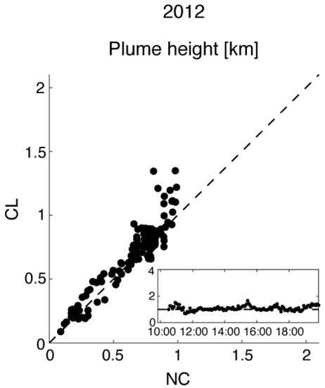 Finally, an assessment of plume height in 2012CL and 2012NC, diagnosed from the height of the 15 µg m−3 domain-maximum five-minute mean concentration contour in the AC/F simulations, is presented in Figure 13. The plume height scatter plot indicates that the overall influence of the canopy on plume height in the 2012 case is minimal, outside of the period from 15:00 to 16:00 EDT when plume heights are greater in the 2012CL simulation due to a more upright plume (cf. Figure 13 to Figure 5b,d). The time series of plume height ratios (Figure 13 inset) suggest that the result is otherwise insensitive to time of day.