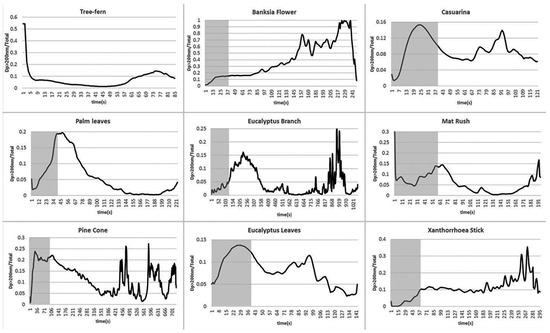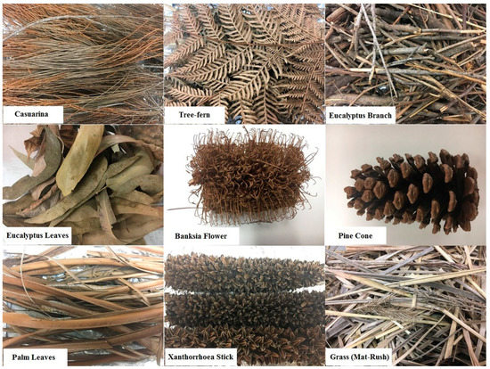 | Fuel Type | Eucalyptus Leaves | Eucalyptus Branches | Grass (Matt Rush) | Palm Leaves | Banksia Flower | Xanthorrhoea | Pine Cone | Casuarina | Tree-Fern | ||||||||