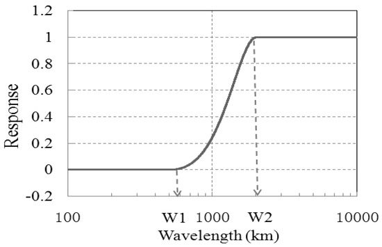 Figure 2 shows an example function of the low-pass filter, which is also commonly called the amplitude response function of the filter. For this low-pass filter, all scales shorter than “w1” km were removed and all scales larger than “w2” km were preserved. For the scales between “w1” and “w2”, the physical field was partly removed through a gradually varying transfer function with a soft cut-off [