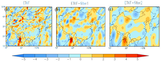 Figure 3b). Furthermore, the ETKF-filter2 perturbation state retains a much larger perturbation scale than that of ETKF and ETKF-filter2, which basically only keeps the synoptic scale perturbations.