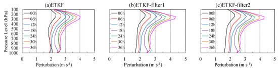 −1 for the 36 h forecast. When comparing lower levels, we found that ETKF-filter1 and ETKF-filter2 had less amplitude than the ETKF at the initial time, but the perturbation growth was very obvious, and the amplitude of both ETKF-filter1 and ETKF-filter2 perturbations was equal to that of ETKF or slightly larger for the long-range forecast.
