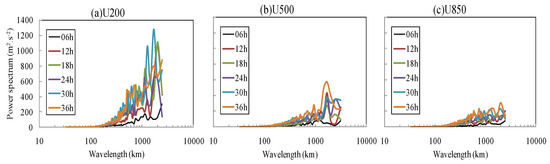 Figure 5b shows that the most powerful scale was above 1000 km for zonal wind at 500 hPa, and the large-scale spectra magnitude was larger than the small-scale spectra magnitude. In regard to 850 hPa (