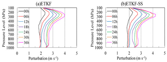 Figure 7b) was relatively small, but the perturbation growth for ETKF-SS was more remarkable. The largest perturbation amplitude for ETKF-SS at 36 h was approximately 4.3 m s