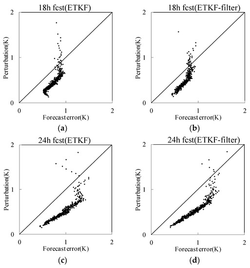 Figure 8a) that the ensemble perturbations underestimate the forecast error for a large amount of grid points, since many sample points are located under the diagonal line; however, the perturbation magnitude of ETKF-SS can also be smaller than that of the forecast error, but more sample points are close to the diagonal line. For the 24 h forecast, the results were similar to those of the 18 h forecast; the ETKF (