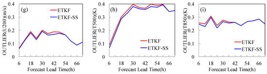 Figure 9e–i, the ETKF-SS had a smaller outlier value than the ETKF for all the variables, indicating that the observations were more likely to fall within the ETKF-SS forecast.