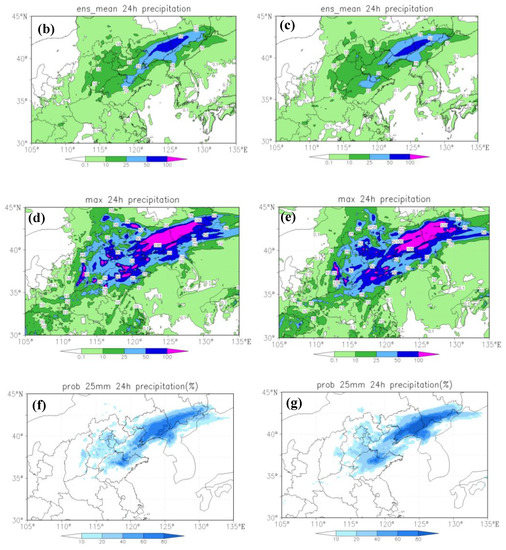 Figure 10b) deviated from the observation, and it did not give a good simulation on the strong precipitation center located in Shangdong, indicating that most of the members did not predict the precipitation center well.