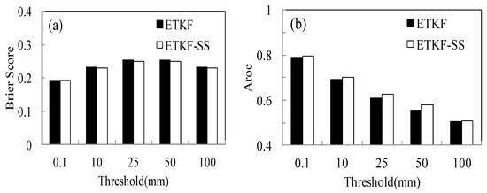Figure 11a, the Brier score of the ETKF-SS performed slightly worse in light and medium precipitation but better than the ETKF in heavy precipitation over 25 mm; the AROC of the ETKF-SS was also better than that of the ETKF (