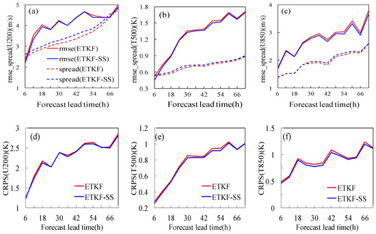To further study the improvement effect of the ETKF-SS on regional ensemble prediction, the continuous grade probability score (CRPS) was calculated for the ETKF and ETKF-SS. The CRPS is a commonly used ensemble prediction probability score [24], which can quantitatively compare the difference between the predicted cumulative distribution probability and the observed cumulative distribution probability. The CRPS score is negatively oriented, where higher values indicate poorer probabilistic performance of the ensemble forecast system. Figure 9d–f shows the time-series of the CRPS scores for the ETKF and ETKF-SS. It is clear that the ETKF-SS performed better (with a smaller CRPS value) than the ETKF for all the variables at all forecast lead times. Specifically, the ETKF-SS outperformed the ETKF at short forecast lead times for upper-level variables, and the ETKF-SS had obviously better performance for U200 within the 24 h forecast, while for the lower level, the advantage occurred throughout the 72 h forecast. The CRPS verification on other variables can give similar results (not shown).