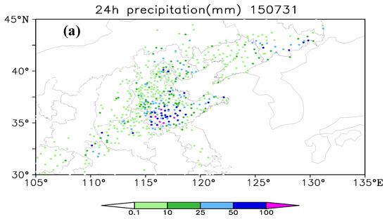 Figure 10a shows the 24-h cumulative precipitation of the observation from 00 UTC 30 July 2015 to 00 UTC 31 July 2015. It can be seen that the range of precipitation was so wide that it affected most parts of North China; the strong precipitation center was located in central and southern Shandong, and the precipitation level reached more than 100 mm.