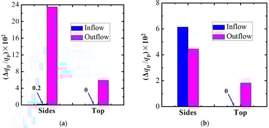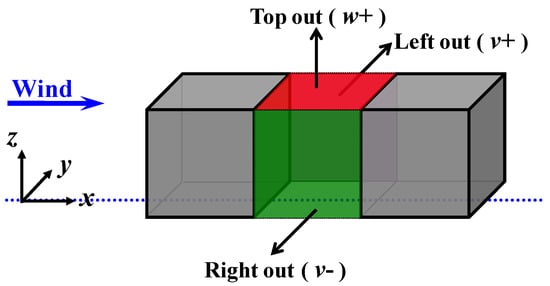 where < > is the ensemble average; ρ, the density of air; Ai, the area of the ith mesh face; un, the instantaneous velocity component perpendicular to the mesh face. The vertical velocity component w is used for the top surface, and the lateral velocity component v is used for the side surfaces. At the top surface, a positive w value signifies air outflow. For the left surface, a positive v value signifies air outflow, and for the right surface, a negative v value signifies outflow. In Equation (1), m + k should equal the total mesh faces at one boundary surface.