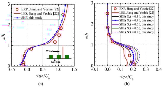 Figure 2 shows comparisons of the normalized mean streamwise velocity and mean concentration in a vertical centerline located between the eighth and ninth rows of the building blocks. As illustrated in Figure 2a, the difference between the mean streamwise velocities predicted by the SKE and LES models is quite small, and both CFD results are in good agreement with the experiment in this vertical centerline. Because the turbulent Schmidt number (Sct) is essential for predicting a concentration field when a RANS model is adopted, this value must be selected carefully. Tominaga and Stathopoulos [] reviewed studies on the selection of Sct for engineering applications, and the optimum values are widely distributed in the range of 0.2–1.3. The influence of different Sct values on the predicted concentration field was also examined in this study. As shown in Figure 2b, large differences are observed for the predicted concentration field. Although the concentration is somewhat underestimated by the LES model, the distribution pattern predicted by the LES model is more similar to the experiment compared with that predicted by the SKE model. A higher Sct value lead to overestimation of the concentration field in the SKE model, and Sct = 0.4 provides the best result. Although not shown here, when the comparisons are concerned in a horizontal direction at a ground level, the LES results showed the best agreement with the experiment. The mean streamwise velocity was a little underestimated and the mean concentration was overestimated by the SKE model in the passageways (or channels) between the columns.