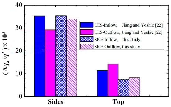 The performance of the SKE model in calculating air flow rates in a 3D street canyon was evaluated through comparisons with the LES results, as presented in Figure 3. This street canyon was located in the middle column between the blocks of the eighth and ninth rows. q’ = ρUhh2 was used to normalize the air flow rates. In Figure 3, the blue and pink charts indicate the air inflow and outflow rates, respectively. The LES results show that for both the side and top surfaces, the difference between the air inflow and outflow rates is nonsignificant. The air flow rates at the side surfaces are much higher than those at the top surface. The air flow rates calculated by the SKE model are quite similar to the LES results, although they are slightly underestimated at the top surface. Overall, the prediction accuracy of the SKE model is satisfactory if an appropriate Sct value is selected, and the SKE model can be used to investigate the ventilation and dispersion phenomena in a 3D thermal environment. Another benefit of using RANS model is that the full-scale simulations can be conducted.