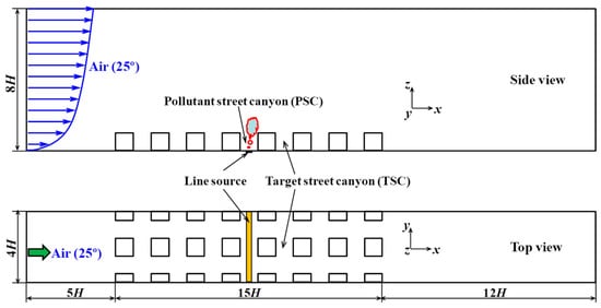 Urban street canyons are located at the bottom of a turbulent atmospheric boundary layer. They typically exhibit a distinct climate in which usually the microscale meteorological processes dominate []. With the increase in urbanization and human activities, the deterioration of air quality in urban environment has caused serious problems for people living inside street canyons. Better ventilating performance is considered an effective countermeasure to improve the thermal environment and air quality inside street canyons.