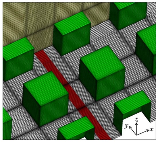 The boundary layer profiles (Equations (8)–(11)) recommended by AIJ were proposed as inflow conditions. The outlet boundary was located at a distance of 12H from the back surface of the last row of the building blocks, and a zero-gradient condition was used for the outlet boundary. The height of the domain was 8H, and a symmetry condition was adopted for the top boundary. The width of the domain was 4H, and symmetry conditions were used for the two side boundaries to indicate that both the geometry and the flow/dispersion were infinitely repeated in the spanwise direction. The width of the pollutant discharge line was W = 3 m in the streamwise direction, and a small mass flow rate of qp = 1.47 × 10−3 kg/s (100%) was used to reduce the effect of gas discharging on the flow field. The reference concentration was C* = qp/(ρUHH2). The temperature of the discharged pollutant was set to 25 °C (same as that of incoming air). Notably, thermal stabilities are usually stronger for full-scale simulations, and setting a higher temperature for the discharged pollutant may destroy the normal flow structures inside the street canyon. The wall boundary conditions were used for the ground and building surfaces. The temperature of building surfaces was set to 25 °C, and different ground temperatures were given to generate different heating intensities. For full-scale simulations, capturing near-wall flows is currently impossible owing to computational limitations; therefore, wall functions were used to model the near-wall flow, and this is the best choice when high-Reynolds-number RANS models are used in most engineering fields. Hexahedral mesh systems were used for the simulations. The influence of mesh density on the simulations was checked through the case of GH-30 using three mesh systems (1,000,000, 3,000,000 and 4,000,000 cell numbers). The results showed that slight differences existed between the first and the final two mesh systems for the calculated scalar field (concentration and turbulent kinetic energy). The calculated flow variables showed nearly no difference between the second and third mesh systems. Therefore, the third mesh system with more meshes (4,000,000) was used in this study to adequately capture the buoyancy effect in a thermal environment. Figure 5 shows the mesh system used in this study. The grid number in each direction was 494 × 109 × 81 (x × y × z); more meshes were used for the fourth, fifth, and sixth rows of the building blocks and the street canyons between them to ensure that the flow could be well predicted for the investigated street canyons. In addition, 16 points were used for discretizing the gas discharge line in the stream-wise direction. The depth of the first fluid cells on the floor and building surfaces was set to 120 mm. The non-dimensional distances (y+) from the first fluid cells to the wall surfaces were less than 1000 in most regions of the building surfaces; this satisfies the requirement that y+ should usually be in the range of 30–1000 when the logarithmic law is used. Finer meshes were adopted near the wall surfaces, and the mesh increasing rates were controlled to less than 1.25. This study investigated purely ground heating effects on ventilation and pollutant transport phenomena through this mesh system.