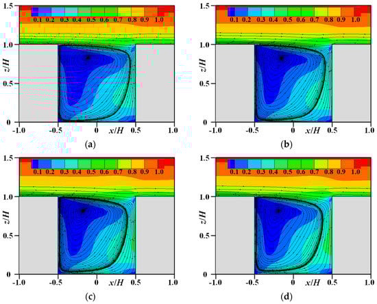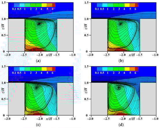 Mean streamlines and normalized velocity magnitude (U2 + V2 + W2)0.5 / UH in symmetry plane (y = 0, target street canyon (TSC)): (a) GH-30; (b) GH-40; (c) GH-50; (d) GH-60.