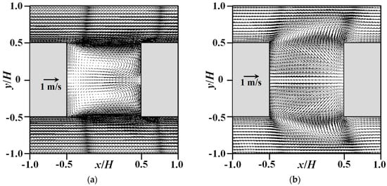Figure 7 illustrates the mean velocity vectors in a horizontal plane at half building height (z/H = 0.5), and in a horizontal plane at the ground level (z/H = 0.1) of the TSC (GH-30). From Figure 7a, when air entered the street canyon from the side surfaces, except for the small part of air leaving the street canyon at the corners, most of the air flowed toward the inner area owing to the impinging effect of the windward wall; this formed a recirculation region inside the street canyon. Air leaving the street canyon from the side surfaces is clearly illustrated in Figure 7b at the ground level; this disturbed the flow in the passageways. These flow structures are quite similar to the CFD results obtained by Kim and Baik [] in their unsteady simulations using the RANS model. Figure 6 and Figure 7 together clearly reveal that air entered the street canyon from the top surface and upper area of the side surfaces, and flowed out of the street canyon from the lower part of the side surfaces. Figure 8 shows the distributions of normalized mean streamwise velocity in a vertical centerline of the TSC. The experiments obtained by Uehara et al. [] for different unstable thermal stratifications are also presented herein as references. Clear strong reverse flow was observed in the lower part of the street canyon for stronger ground heating cases in the CFD results, a tendency similar to that observed in the experiments conducted by Uehara et al. []. Cheng and Liu [] derived the same conclusions in their simulations of 2D street-canyon flows. The discrepancy between the current CFD results and the experiments conducted by Uehara et al. [] may arise from the different inflow conditions, different scales, and different block arrangements. Another factor may be the inaccuracy of the RANS model for full-scale simulations. According to the study by Chew et al. [], it has the possibility that the performances of the RANS models become inaccurate for full-scale simulations in some cases, such as windward wall heating.