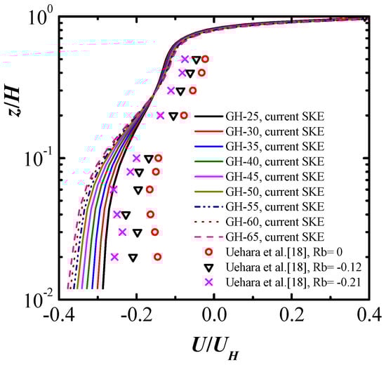 Figure 7 illustrates the mean velocity vectors in a horizontal plane at half building height (z/H = 0.5), and in a horizontal plane at the ground level (z/H = 0.1) of the TSC (GH-30). From Figure 7a, when air entered the street canyon from the side surfaces, except for the small part of air leaving the street canyon at the corners, most of the air flowed toward the inner area owing to the impinging effect of the windward wall; this formed a recirculation region inside the street canyon. Air leaving the street canyon from the side surfaces is clearly illustrated in Figure 7b at the ground level; this disturbed the flow in the passageways. These flow structures are quite similar to the CFD results obtained by Kim and Baik [] in their unsteady simulations using the RANS model. Figure 6 and Figure 7 together clearly reveal that air entered the street canyon from the top surface and upper area of the side surfaces, and flowed out of the street canyon from the lower part of the side surfaces. Figure 8 shows the distributions of normalized mean streamwise velocity in a vertical centerline of the TSC. The experiments obtained by Uehara et al. [] for different unstable thermal stratifications are also presented herein as references. Clear strong reverse flow was observed in the lower part of the street canyon for stronger ground heating cases in the CFD results, a tendency similar to that observed in the experiments conducted by Uehara et al. []. Cheng and Liu [] derived the same conclusions in their simulations of 2D street-canyon flows. The discrepancy between the current CFD results and the experiments conducted by Uehara et al. [] may arise from the different inflow conditions, different scales, and different block arrangements. Another factor may be the inaccuracy of the RANS model for full-scale simulations. According to the study by Chew et al. [], it has the possibility that the performances of the RANS models become inaccurate for full-scale simulations in some cases, such as windward wall heating.