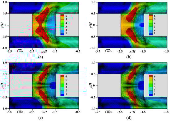 Mean velocity vectors and normalized concentration C/C* in horizontal plane of the PSC (z/H = 0.1): (a) GH-30; (b) GH-40; (c) GH-50; (d) GH-60.