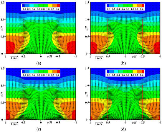 Mean velocity vectors and normalized concentration C/C* in middle cross section of the TSC (x/H = 0): (a) GH-30; (b) GH-40; (c) GH-50; (d) GH-60.