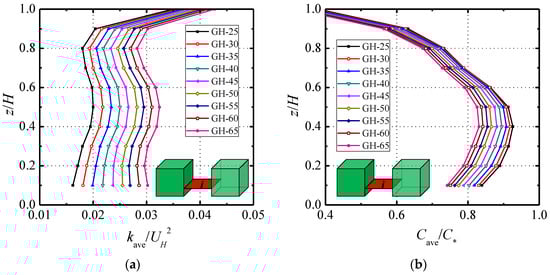 To further examine the effect of ground heating on the concentration field, plane averaged scalar fields (turbulent kinetic energy and mean concentration) in the TSC were assessed, as shown in Figure 12. Along the vertical direction, 10 horizontal cross sections were generated per meter, and the scalar fields were averaged in each section according to the following equation: