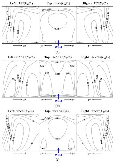 Figure 13 presents normalized pollutant fluxes of normal direction at the three boundaries of the TSC. Only the case GH-30 is shown here; the distribution patterns in the other cases were quite similar to that in this case. The convective flux has the same sign as the mean velocity perpendicular to the boundary. The convective flux WC was negative in most areas of the top surface, indicating that the pollutant was transported into the street canyon by air convection in these regions. Small areas with positive WC values could also be observed near the leeward and windward walls owing to air outflow in these regions. Positive turbulent diffusion flux <w’c’> throughout the top surface indicated that the sole effect of turbulence was to remove the pollutant from the street canyon at this surface. The same conclusions have also been obtained by Cheng and Liu [] in their simulations of a 2D street-canyon flow and by Jiang and Yoshie [] in a 3D urban flow simulation. The positive <w’c’> value was larger than the negative WC value at the top surface, leading to a positive value of the total pollutant flux <wc> throughout the top surface. This means that for the averaging effect, the pollutant was transported out from entire top surface and the pollutant did not enter the street canyon from the top surface, although the concentration was not zero above the roof. As indicated in Figure 13a, the pollutant was transported into street canyon from the passageways by air convection in nearly three-quarters of the upper side surfaces; this is consistent with that shown in Figure 11. The pollutant was transported out by air convection through the lower regions of the side surfaces. As shown in Figure 13b, the area with negative values of turbulent diffusion flux <v’c’> was mainly located in the lower half regions of the left surface. According to the gradient diffusion hypothesis of Equation (3), we can conclude that the negative <v’c’> values at the left surface imply a positive gradient of the mean concentration in these regions; therefore, the pollutant concentration in the passageways was higher than that inside the street canyon. Because the magnitude of VC was much larger than <v’c’> at the side surfaces, the distribution pattern of the total pollutant flux <vc> became more similar to that of the convective flux VC; therefore, air convection dominated the pollutant transport at the side surfaces.