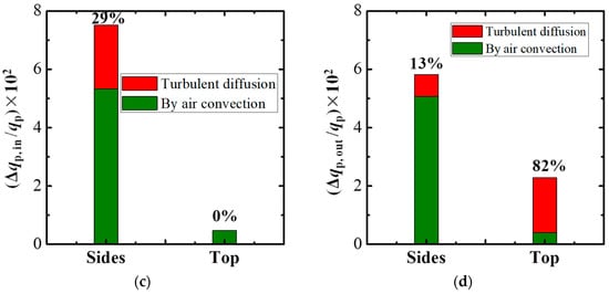 Contributions of air convection and turbulent diffusion to pollutant flow rates at the boundaries of the PSC and TSC (GH-30): (a) pollutant inflow rates (PSC); (b) pollutant outflow rates (PSC); (c) pollutant inflow rates (TSC); (d) pollutant outflow rates (TSC). (The percentages in the Figures mean the red bar/total bar).