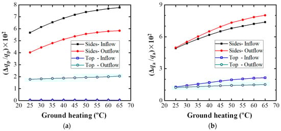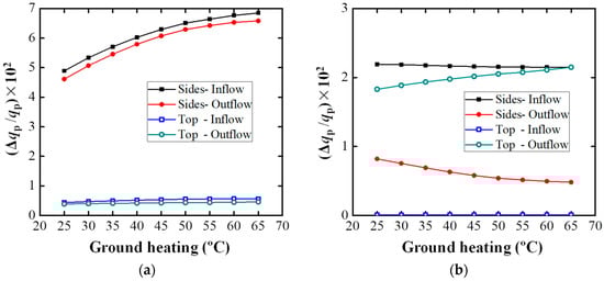 Figure 16 displays the contributions of air convection and turbulent diffusion to pollutant flow rates at the boundaries of the TSC as the ground temperature increased. As presented in Figure 16a, as the ground temperature increased, the contributions of air convection to both pollutant inflow and outflow rates increased significantly at the side surfaces; this can primarily be attributed to the enhancement of ventilation at the side surfaces. At the top surface, the contributions of air convection to both pollutant inflow and outflow rates exhibited slight changes as the ground heating intensity increased. The contributions of air convection to pollutant inflow rates were a little larger than those to pollutant outflow rates at both the side and top surfaces. As illustrated in Figure 16b, as the ground temperature increased, the contributions of turbulent diffusion to both pollutant inflow rates (black line) and outflow rates (red line) slightly decrease at the side surfaces, and the decreasing speed of the red line was a little faster. At the top surface, the contributions of turbulent diffusion to pollutant inflow rates were zero for all cases, and those to pollutant outflow rates gradually increased with the ground temperature, indicating that the sole effect of turbulent diffusion was to remove the pollutant from the street canyon at the top surface. A comparison of Figure 16a,b could reveal that air convection dominated pollutant transport (both inflow and outflow) at side surfaces; however, turbulent diffusion dominated pollutant transport at the top surface, mainly to pollutant outflow. Because of recirculation inside the street canyon, the pollutant with a higher concentration could not be easily transported out through the top surface by air convection; consequently, turbulent diffusion dominated pollutant removal at the roof level.