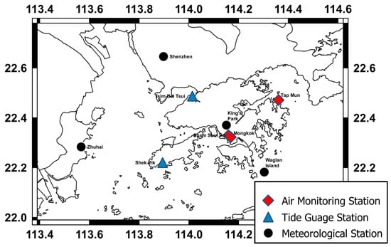Locations of the monitoring stations in the Pearl River Delta (PRD) used in the study. The black dots, blue triangles, and red diamonds represent the meteorological stations, the tide gauge stations, and the air quality monitoring stations, respectively.