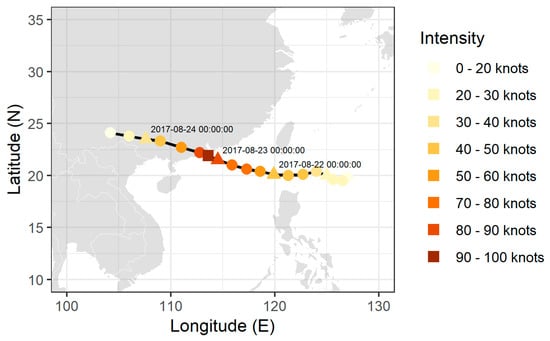 Evolution of the trajectory and intensity (knots) of tropical cyclone (TC) Hato from 20 August 2017 to 24 August 2017, according to the JTWC. Triangles represent the time at 00 Universal Time Coordinated (UTC). The maximum intensity of Hato is denoted as a square, which is at 03 UTC.