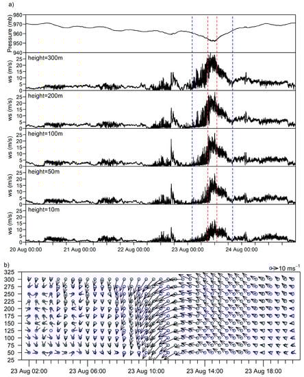 Time series of (a) pressure (mb) at an altitude of 300 m and wind speed (m s−1) as a 1-min average from 20 August 2017 to 24 August 2014 LST, and (b) the vertically interpolated wind profile at 30-min time intervals during the period from 02:00 to 20:00 LST on 23 August 2017, measured at Shenzhen station. The red lines represent the peak wind speed periods between 0900 and 1300 LST, and the blue lines illustrate the periods of the wind profile illustrated in (b).