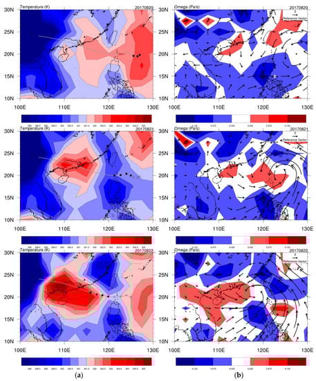 Evolution of (a) surface temperature (K), (b) wind field (vector, m s−1), and omega (color shading, Pa/s) at 0600 UTC within South China and the South China Sea (SCS) during the period 20 August 2017 to 22 August 2017. The black dots and lines shown in (a) denote the location of TC Hato at 00, 06, 12, and 18 UTC and the whole of TC Hato’s track, respectively.
