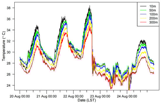 Evolution of the local temperature in Shenzhen at different heights during the period 20 August 2017 to 24 August 2017.