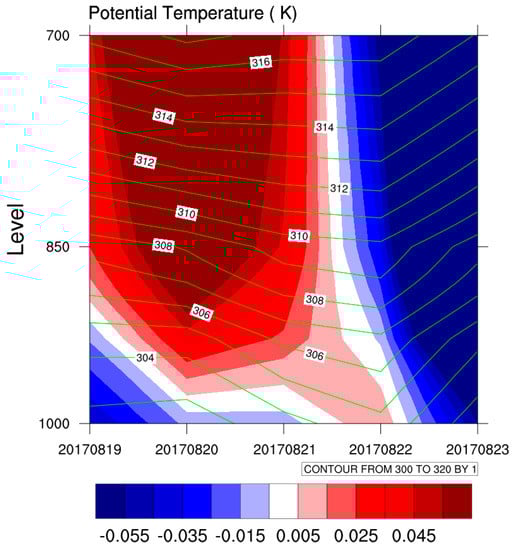 Figure 7 illustrates the evolution of the potential temperature and vertical motion during the period 19 August 2017 to 23 August 2017 in the lower atmosphere. The potential temperature represents the near-surface temperature when an air mass at a certain pressure level is adiabatically brought to the ground level. Both the lower-level potential temperature and the sinking motion were strengthened during the period 20 August 2017 to 22 August 2017, which can lead to temperature increases at the surface. In addition, a regional-scale northwesterly wind was observed on 22 August 2017, which enhanced the temperature advection from the northwestern area to Shenzhen, Hong Kong, and Macau. Furthermore, the local daily mean cloud cover faction recorded by the HKO during the period 20 August 2017 to 21 August 2017 was 29% and 42%, respectively, which is much lower than the monthly mean of 70%. Because of this, the region experienced strong radiation forcing, which is also one of the factors that contributed to the temperature extreme in this case study.