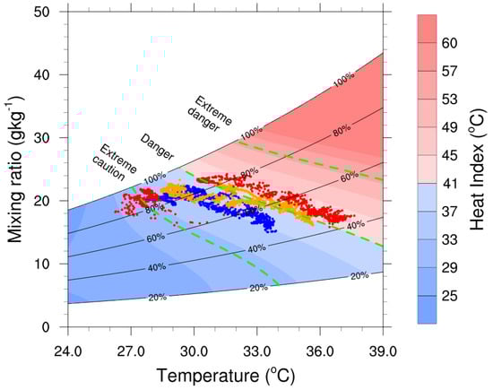 The calculated Heat index (°C) based on the observed temperature and relative humidity at Shenzhen station at a height of 50 m above the ground. The blue, orange, and red dots represent the 1-min average of the heat index on 20 August 2017, 21 August 2017, and 22 August 2017, respectively.