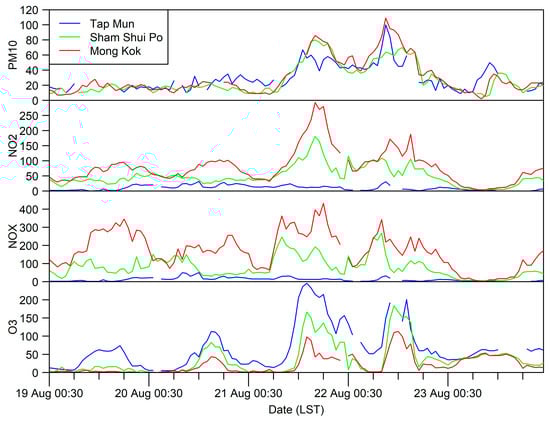 Evolution of the concentration (μg m−3) of PM10, NO2, NOX, and O3 at the Tap Mun, Sham Shui Po, and Mong Kok stations during the period 19 August 2017 to 23 August 2017 LST. Discontinuous lines represent missing data during the study period.