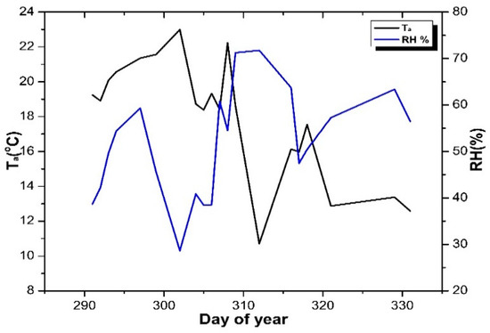 Mean daily values of air temperature and relative humidity for the whole experimental period.