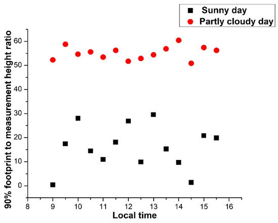 Variation of half-hourly 90% footprint to measurement height ratio Equation (5) for two days one partly cloudy (27/11/2018) and the other with a clear sky (sunny day) (18/10/2018) [28].