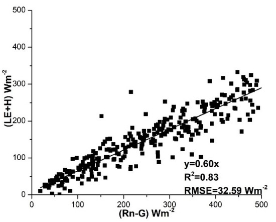 For the energy balance closure analysis, a linear regression was performed between the sum of half-hourly turbulent fluxes (LE+H) vs the available energy (Rn − G), as shown in (Figure 5). The linear regression is Equation (11):