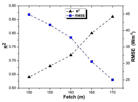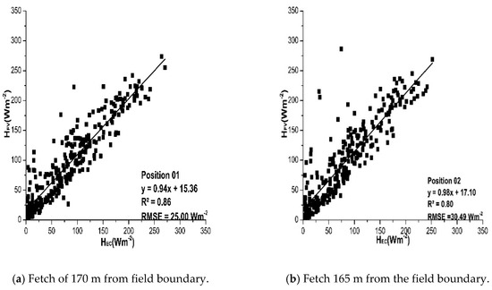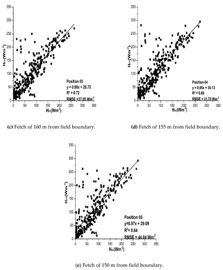 As shown in Figure 6a, very good agreement was observed between the 30-min estimations of HFV and HEC at 170 m from the field edge, with a slope of 0.94, a relatively high R2 = 0.86, low RMSE = 25 Wm−2 and relative error RE = 9.25%. All estimations at the other positions were also in good agreement with the measurements of the EC method, with R2 always larger than 0.6. Some data points, especially in Figure 6b–e show a relatively high estimation of HFV as compared to HEC. The analysis showed that this occurred mainly in the later part of the day, from 15:00 to 16:00. The parameters of regressions between HFV and HEC flux estimates at the five positions are presented in Table 4 and plotted in Figure 7. Figure 7 clearly shows that R2 increases, whereas RMSE decreases with increasing fetch. Hence, a larger fetch provides a better agreement between FV and EC sensible heat flux. This is presumably because with a larger fetch the surface layer becomes more developed and the FV approach, which is based on MOST, is more valid.