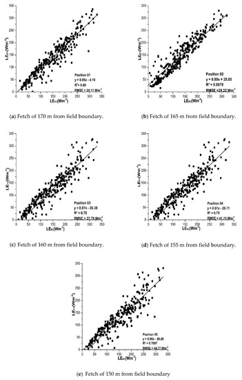 (a) Fetch of 170 m from field boundary; (b) Fetch of 165 m from field boundary; (c) Fetch of 160 m from field boundary; (d) Fetch of 155 m from field boundary; (e) Fetch of 150 m from field boundary. Half-hourly LEFV derived by using Equation (12) plotted against LEEC for unstable conditions during Sep–Nov 2018.