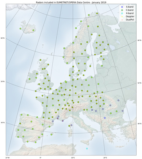 - Huuskonen, A.; Saltikoff, E.; Holleman, I. The operational weather radar network in Europe. Bull. Am. Meteorol. Soc. 2014, 95, 897–907. [Google Scholar] [CrossRef]