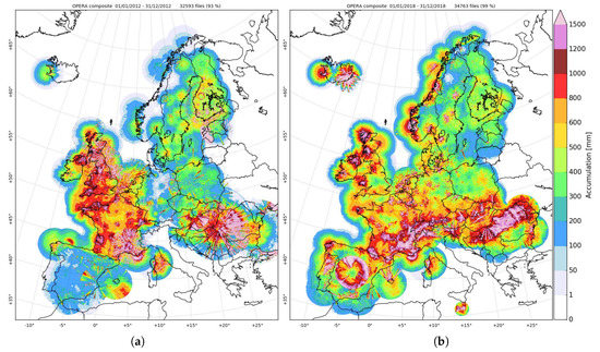 Figure 3 shows the total rainfall accumulation for 2012 and 2018. Such maps allow for the identification of various artifacts and unrealistic spatial variations. In most areas, an increased homogeneity of the composite was obtained in 2018. Assessment of rainrate composites shows that the increase in homogeneity of composites is due to national improvements, both of the radars themselves and of the data sent to OPERA. Furthermore, the beam blocking correction and satellite-based clutter removal methods, implemented in December 2015, also improved the quality of the composite. This is illustrated in Figure 4, which shows the frequency of undetect values in 2015 and 2016. The undetect value can be interpreted as a “dry pixel”. The pixels which are never dry (i.e., blue pixels in the figure) are very likely contaminated by non-meteorological signals, even if these signals are very low in intensity. Comparing 2015 and 2016, we can see the impact of the centralized clutter cancellation methods implemented in the end of 2015.